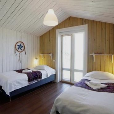 Four of the rooms have bunks with individual reading lights, a cozy lounge space, and a bathroom in the room. See the Villa Mandala website for more details.